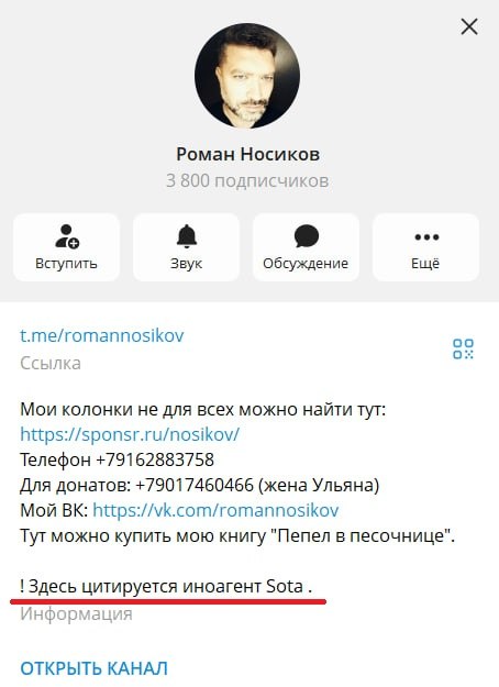 В итоге Носиков указал в описании своего канала, что в нем «цитируется иноагент SOTA».